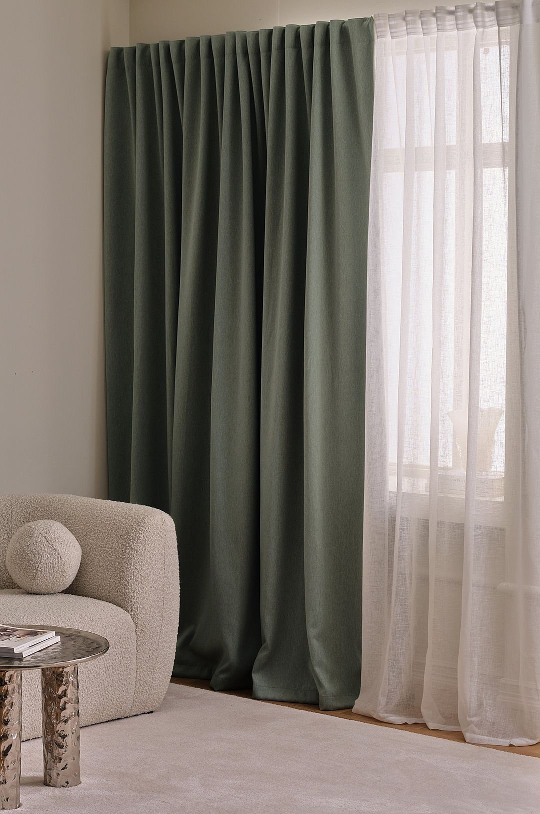 blackout drapes by night on a double track. Enjoy privacy and soft daylight without sacrificing sleep quality.